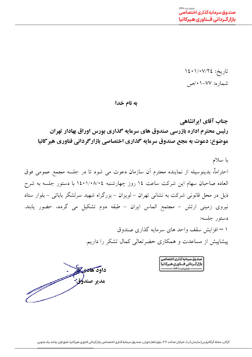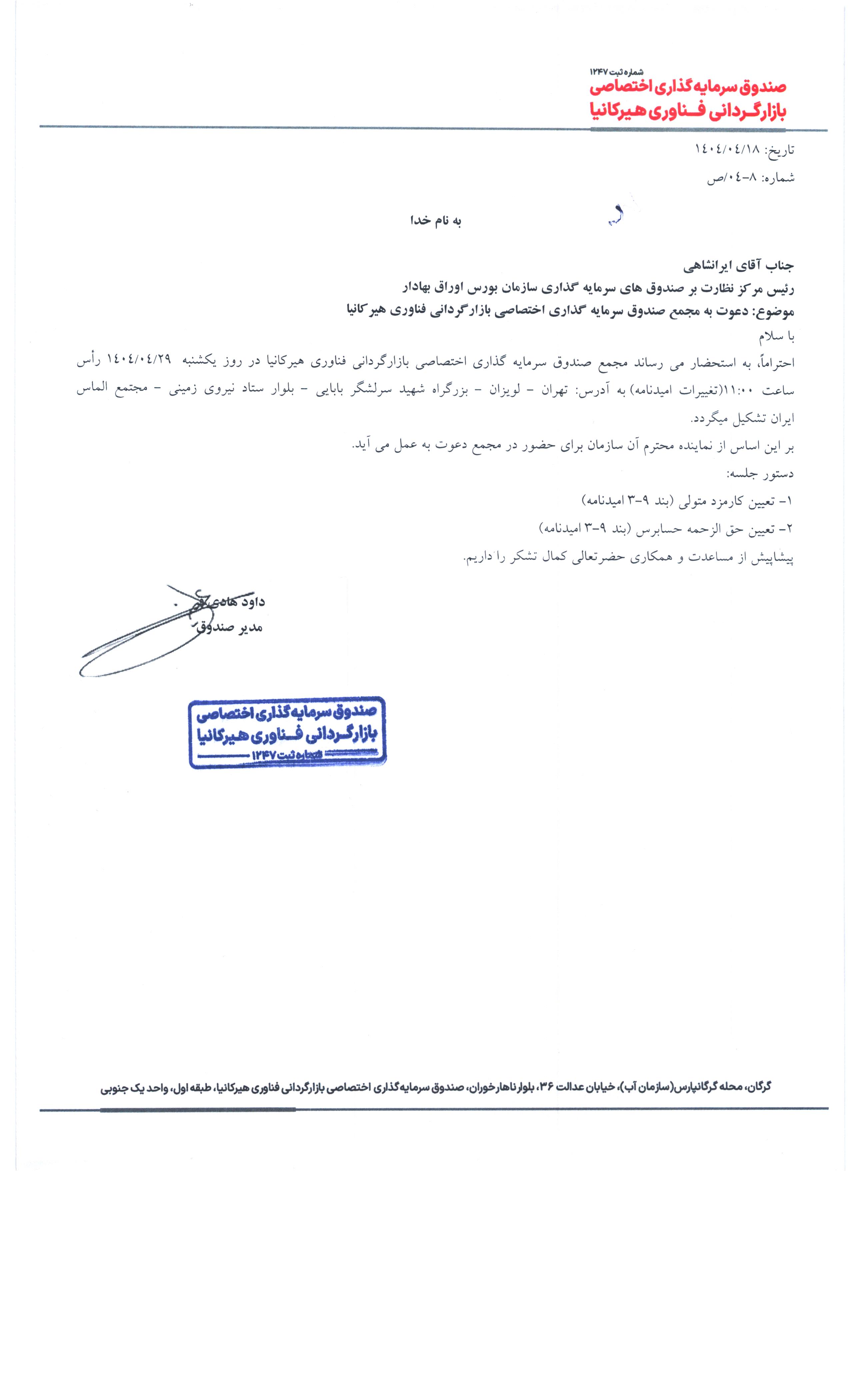 دعوت به مجمع صندوق سرمايه گذاري اختصاصي بازارگرداني فناوري هير کانيا مورخ ۱۴۰۴/۰۴/۲۹ (تغییرات امیدنامه)