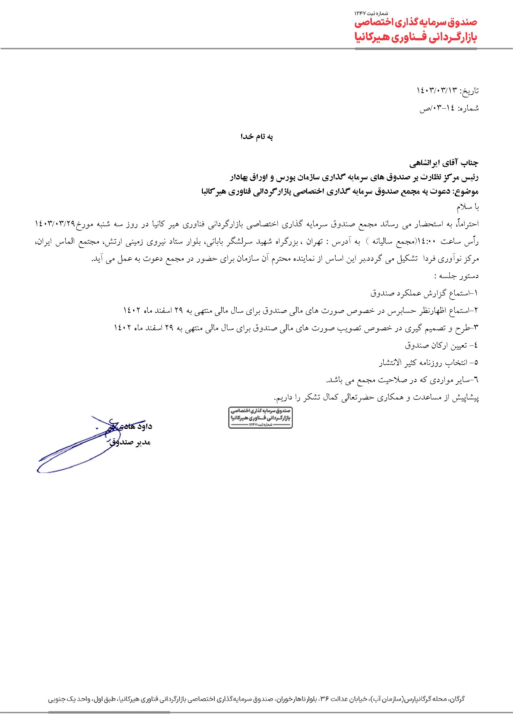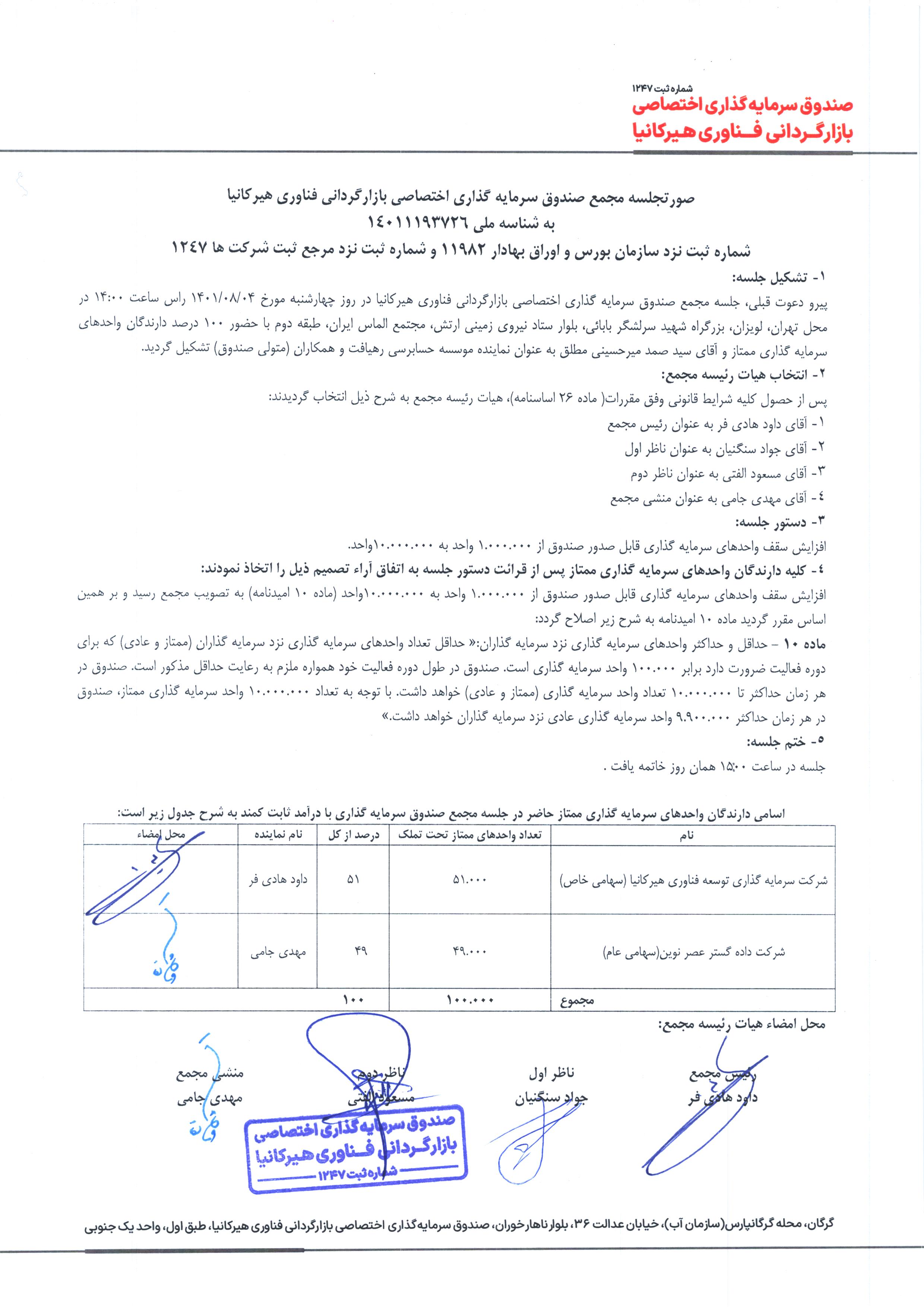 تصمیمات مجمع صندوق سرمایه گذاری اختصاصی بازارگردانی فناوری هیر کانیامورخ ۱۴۰۲/۰۳/۲۸- (مجمع سالیانه )