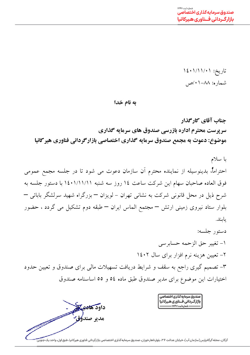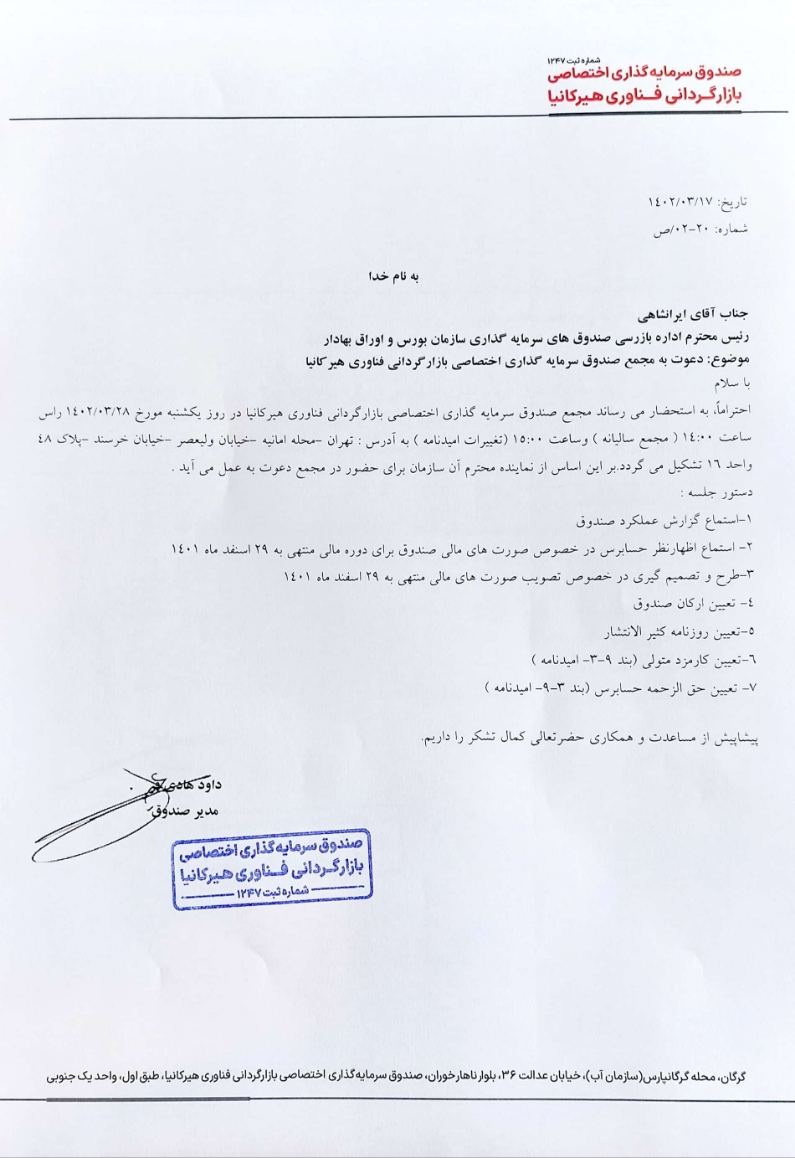 مجمع عمومی موسس صندوق سرمایه گذاری اختصاصی بازارگردانی فناوری هیرکانیا مورخ ۱۴۰۱/۰۲/۲۵ ساعت ۱۰:۰۰