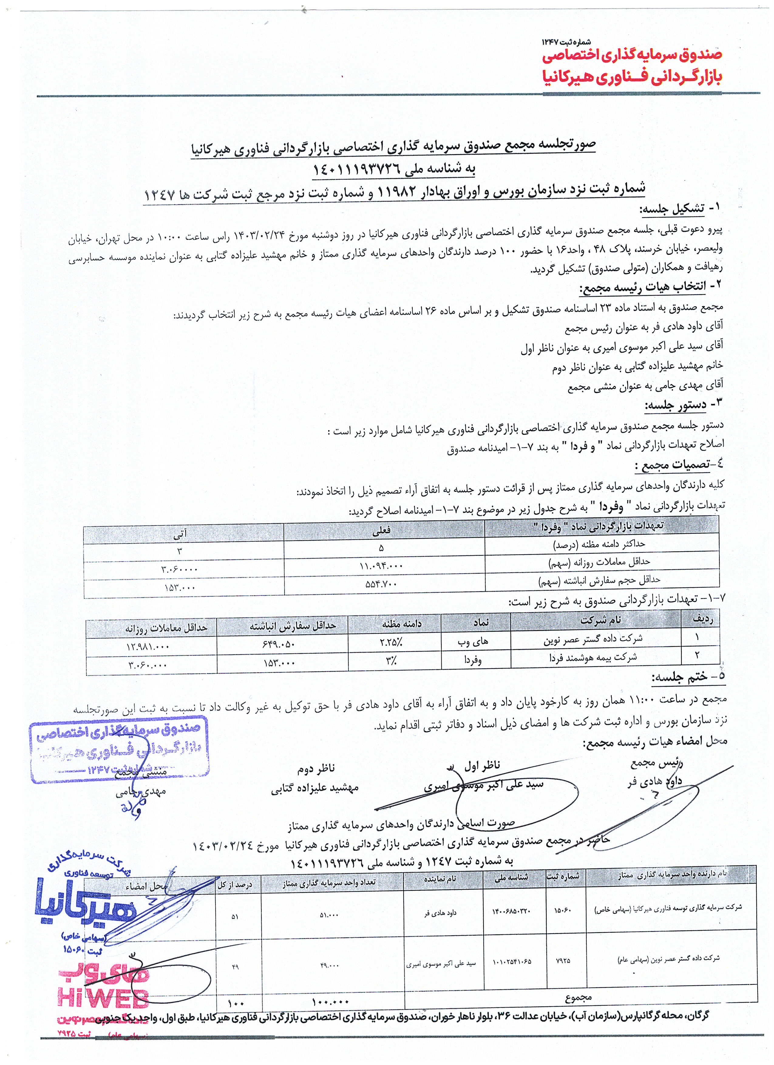 لیست حاضرین وصورتجلسه مجمع صندوق سرمایه گذاری اختصاصی بازارگردانی فناوری هیر کانیا مورخ ۱۴۰۳/۰۲/۲۴ - (اصلاح تعدات بازارگردانی نماد وفردا )