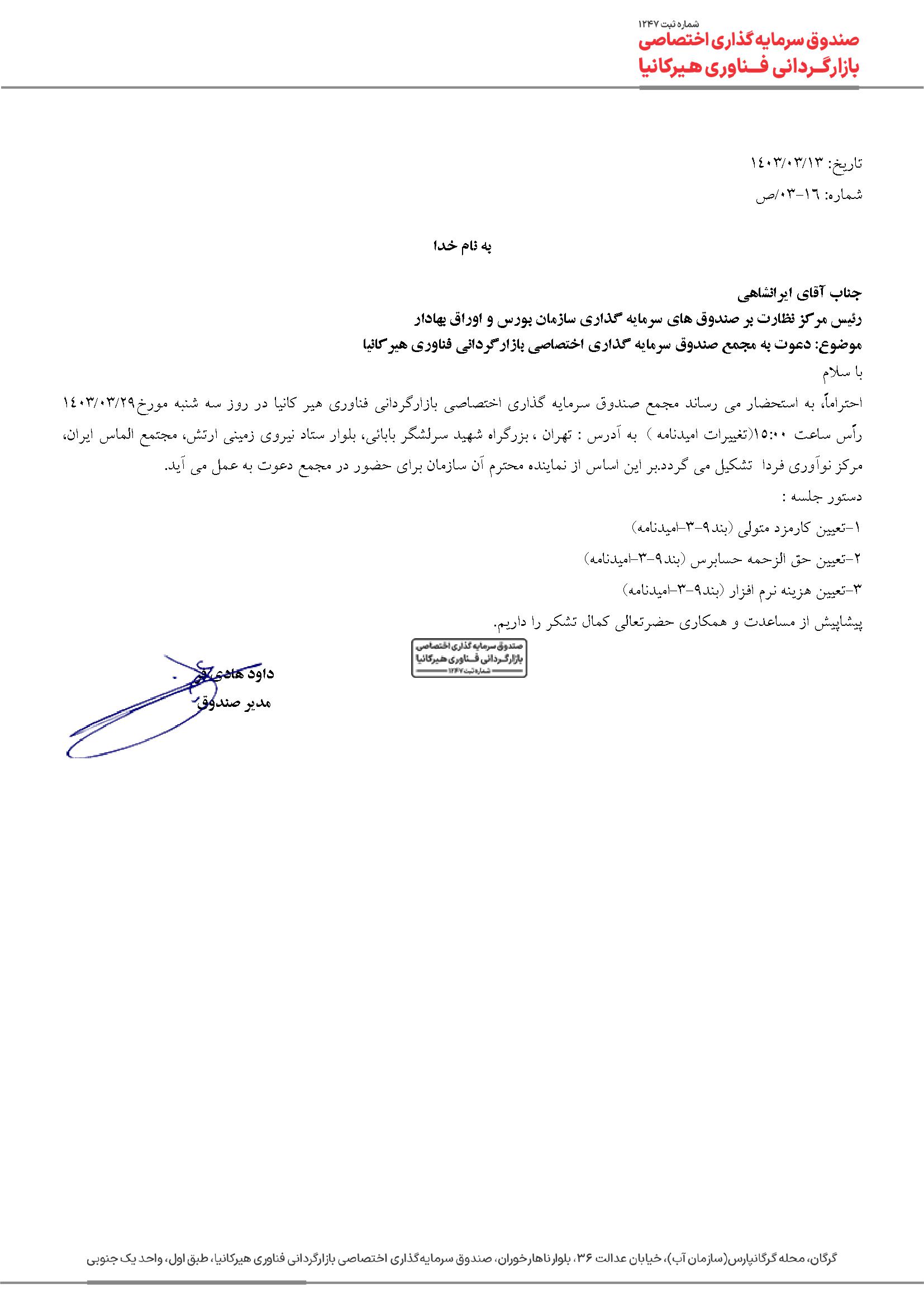 آگهي دعوت به مجمع صندوق سرمايه گذاري اختصاصي بازارگرداني فناوري هير کانيا مورخ ۱۴۰۳/۱۰/۱۲ (تغییرات امیدنامه)