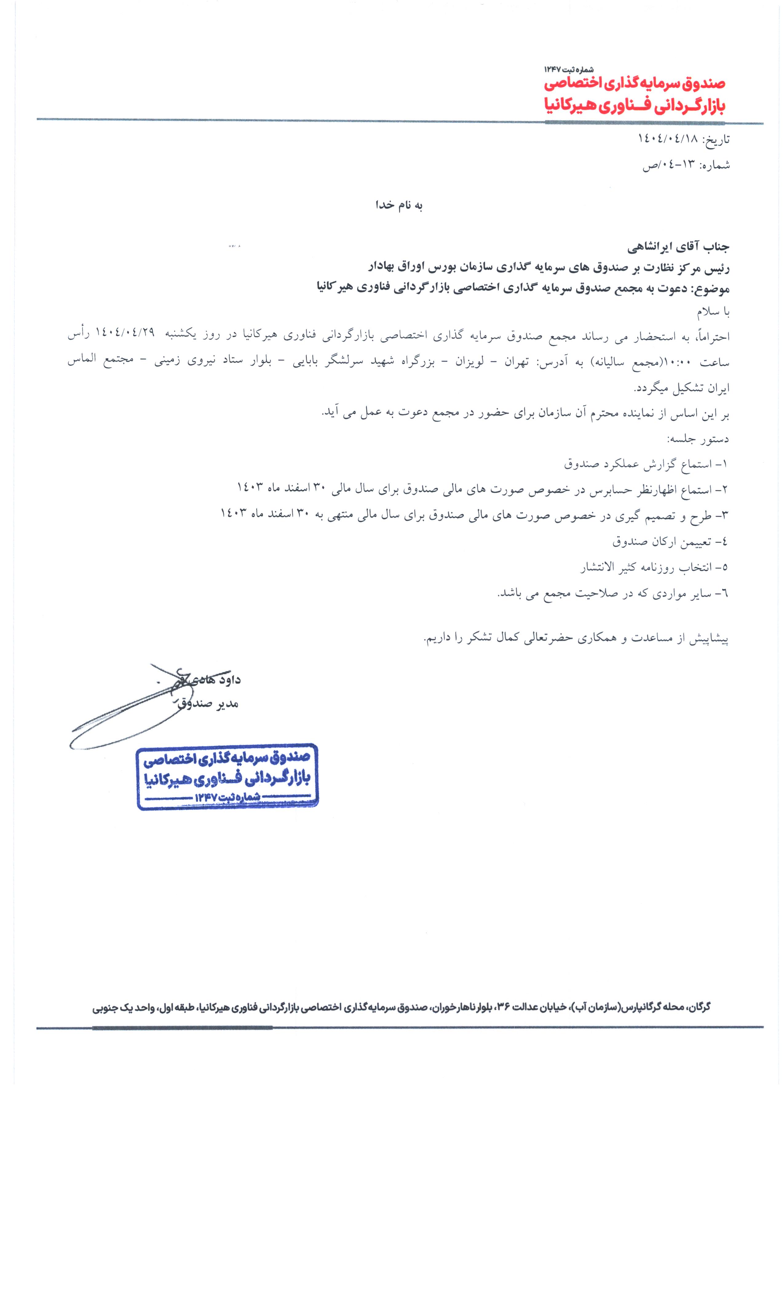 دعوت به مجمع صندوق سرمايه گذاري اختصاصي بازارگرداني فناوري هير کانيا مورخ ۱۴۰۴/۰۴/۲۹ (مجمع سالیانه )